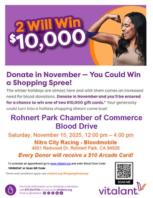 Rohnert Park Chamber and Nitro City Racing have partnered with Vitalant to organize a blood drive to help our community's critical need for blood donations.