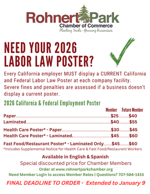 Need your 2026 Labor Law Poster? Special discounted pricing for Chamber Members. You will need a Member Login to access member pricing. Questions? Contact Chamber Office (707) 584-1415 or info@rohnertparkchamber.org