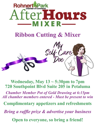 Come join My Self Care Doc and the Rohnert Park Chamber of Commerce for a Networking Mixer & Ribbon Cutting!- Complimentary Appetizers & Refreshments