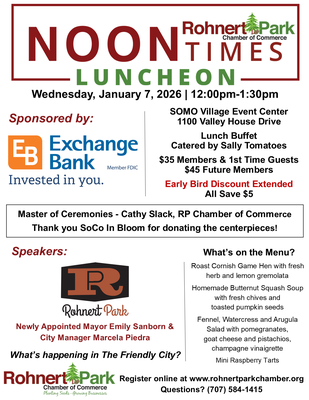 Join us for our January Noon Times Networking Luncheon sponsored by Exchange Bank. Please note new location - Held at SOMO Village Event Center catered by Sally Tomatoes.