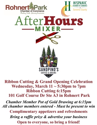 Come join Sandpino's Coffee & Brews and the Rohnert Park & Hispanic Chambers of Commerce for a Ribbon Cutting & Grand Opening Networking Mixer!- Complimentary Appetizers & Refreshments